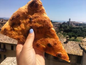Food in Italy has a reputation for being the best because of its fresh, less processed ingredients. Tuscany is known for its wine and cuisine. “La Piccola Ciaccineria” is a pizza place where you can grab a slice of pizza or “ciaccino” which is a Sienese variation of pizza but is essentially stuffed focaccia. Another pizza recommendation is “Mister Pizza” and if you are lucky you will catch Mr. Pizza himself playing his guitar and singing.