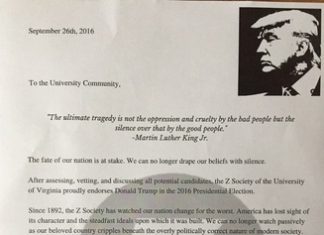 On Tuesday morning, copies of a forged Z Society letter purporting their backing of Donald Trump were posted around Grounds.