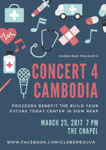 The University of Virginia will be hosting the Concert 4 Cambodia on March 25th from 7-9PM in the University Chapel. The concert is a fundraiser for a non-governmental organization called the Build Your Future Today Center, in Siem Reap, Cambodia, and proceeds from the concert will go towards benefiting the organization. Globemed at UVa has a partnership with this organization and sends 3-6 interns to Cambodia during the summer to do volunteer work.