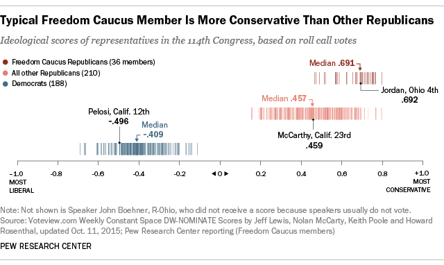 The freedom caucus is by and large among the most conservative of the House Republicans. They are a new, emerging group in the House of Representatives, having spent less time in the House than more seasoned representatives. Of the 36 identified members by Pew Research Center, 26 (72%) were first elected in 2010 or later, compared with 54% of other House Republicans. This means that they’re being elected into office at a faster rate than most representatives.