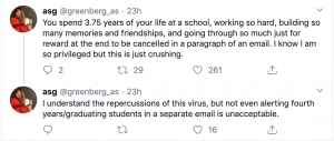 Fourth Year Anne Greenberg (@greenberg_as) said, “Cancelling graduation without letting graduating students know separately or giving them hope for possible graduation plans is a slap in the face of every student who attends the University and puts work into their academics. Without a doubt, this is an unprecedented situation, but letting the class of 2020 be the throwaway class in a hard scenario can’t be the answer.”