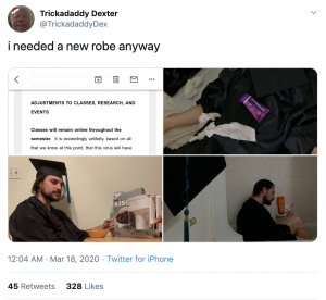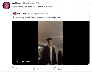 Fourth Year Brian Hnat (@hnattylite) expressed similar sentiment: “I feel like it’s one of the most significant bummers of my life. It’s not just graduation, I’ve been looking forward to the last few months of fourth year for years now. I am sad I will not get to say a proper goodbye to some really special people and the university as a whole. I feel like the class of 2020 was robbed. It is slightly comforting knowing everyone is going through the same thing. I will be devastated if UVA does not reschedule the ceremony.”