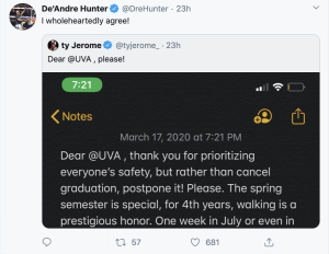 Even former UVa basketball players Ty Jerome and De’Andre Hunter turned to Twitter to show solidarity with the graduating class.