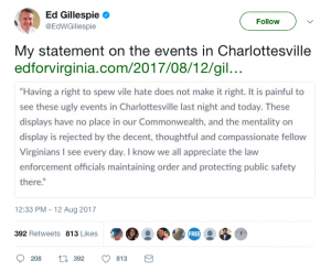 In his official statement, Gillespie stated, “Having a right to spew vile hate does not make it right. It is painful to see these ugly events in Charlottesville last night and today. These displays have no place in our Commonwealth, and the mentality on display is rejected by the decent, thoughtful and compassionate fellow Virginians I see every day. I know we all appreciate the law enforcement officials maintaining order and protecting public safety there.”