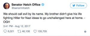 Even some of Trump’s closest allies, such as Senator Orrin Hatch of Utah, tweeted “We should call evil by its name. My brother did not give his life fighting Hitler for Nazis to go unchallenged here at home.”