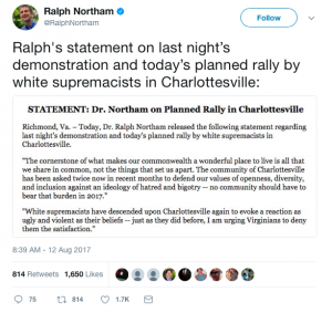 In his official statement, Northam stated, “White supremacists have descended upon Charlottesville again to evoke a reaction as ugly and violent as their beliefs– just as they did before, I am urging Virginians to deny them the satisfaction.”