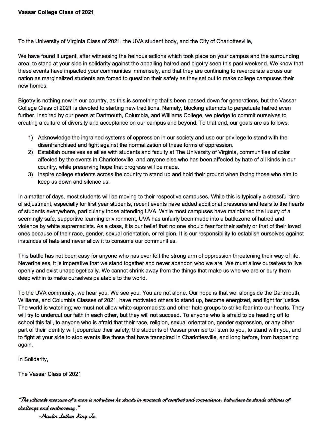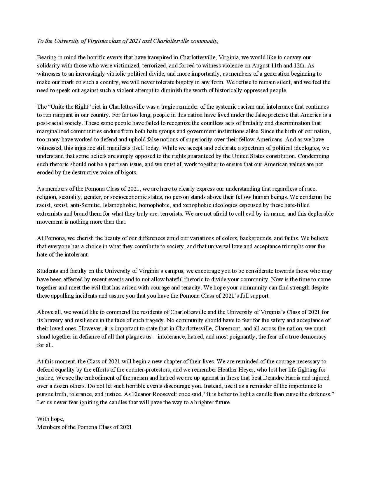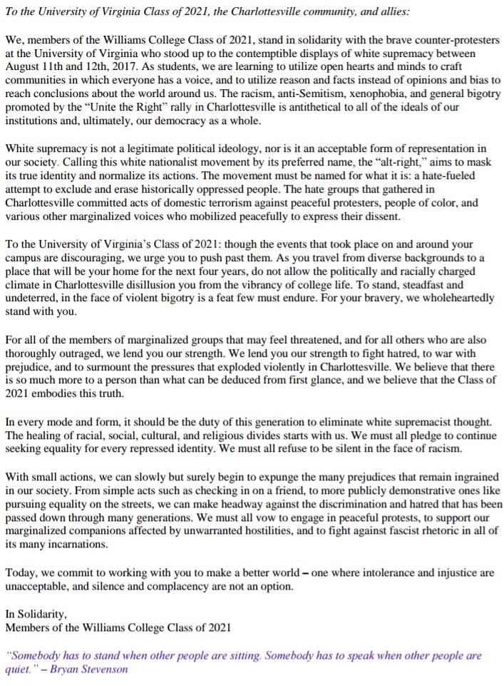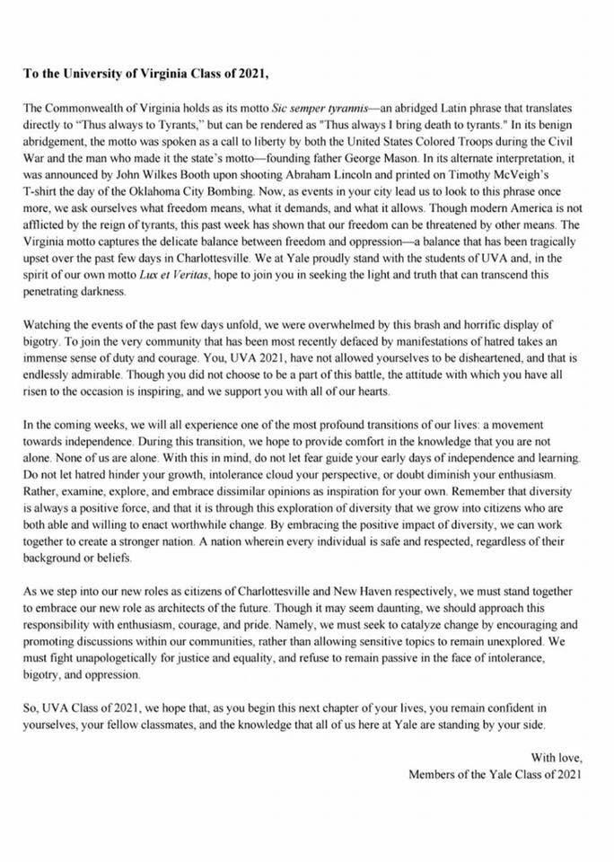 What began as a letter of encouragement from members of the Dartmouth College Class of 2021 to the University of Virginia Class of 2021 has spread across the country. The letters below have materialized on the University of Virginia Class of 2021 Facebook page where 4,657 members of the page can see them. All show solidarity, support, and encouragement as the class of 2021 prepares for coming to Charlottesville next week. We have compiled them in their full form below.