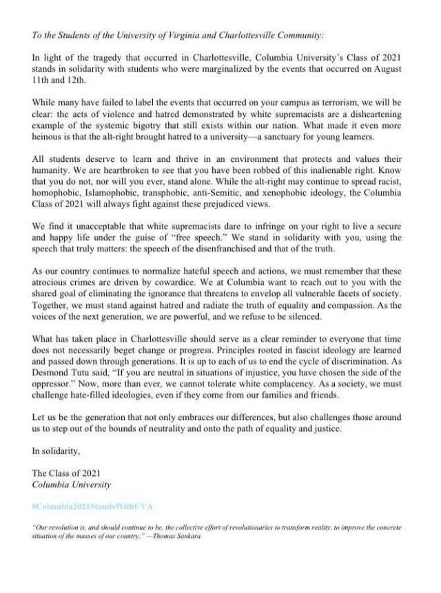 Members of Classes of 2021 Around the Country Announce they Stand in Solidarity with UVA 2021