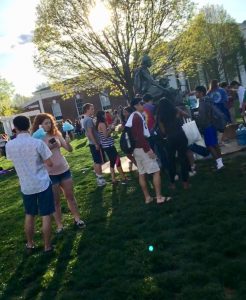 The weather was perfect: warm and breezy. Students lined up for free UPC giveaways, delicious fried chicken, Indian cuisine, and food from Duck Donuts, King of Pops, and Take It Away, among other treats. All three locations were filled with laughter, friends, and good music. People wearing balloon hats and eating cotton candy sat with their friends on blankets and enjoyed the bands playing on Grounds for the event.