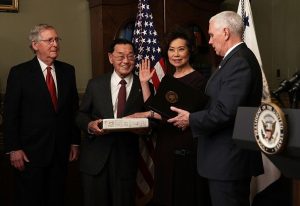 For the Trump Administration, Chao works as the Secretary of Transportation. She was confirmed on January 31, 2017 by the Senate with a vote of 93-6. During the announcement of Chao’s nomination, Trump noted that Chao has “an amazing life story” and praised her for her “extensive record of strong leadership and expertise.”